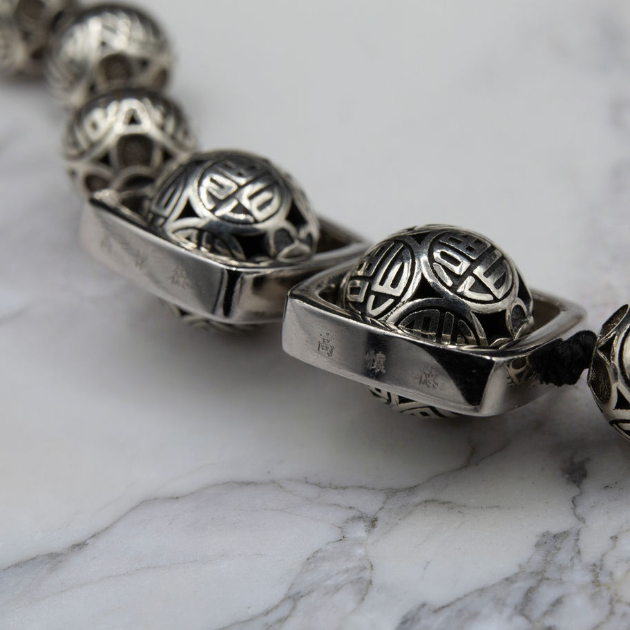 The Short Form Sterling Necklace is composed entirely of sterling silver 925 beads arranged in a continuous circular line that sits close to the collar. The composition is anchored by the KARL WILDER signature square frame and sterling clasp, subtle structural elements that define the architecture of the piece.