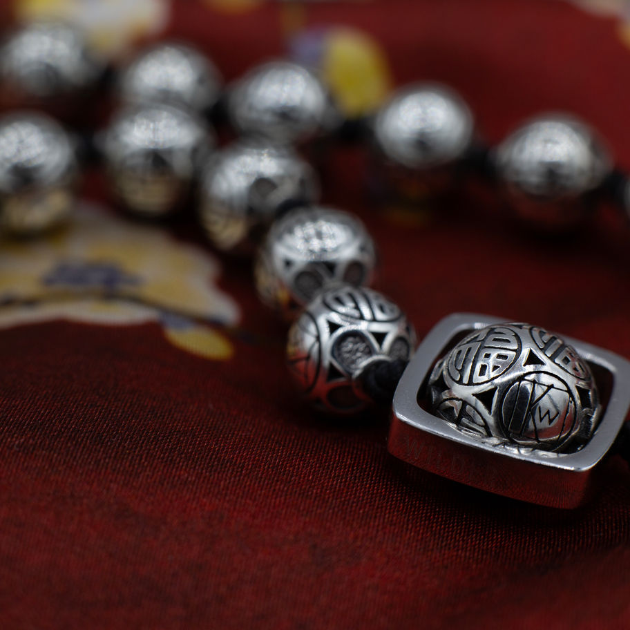 Embrace the serene glow of The Sterling at Karl Wilder.London. This 108-bead unisex necklace is meticulously handcrafted on a luxurious 100% black woven silk cord. Adorned with 8mm sterling silver Fu & signature beads, and crowned with a 10mm sterling silver Fu Guru bead, each piece reflects the gentle, calming radiance of moonlight, harmonising and soothing your energy. Like the moonlight’s silver glow, it guides your Throat and Third Eye Chakras, offering clarity, balance, and quiet strength. More than jewellery, it is a luminous talisman connecting elegance, intention, and the tranquil energy of silver.